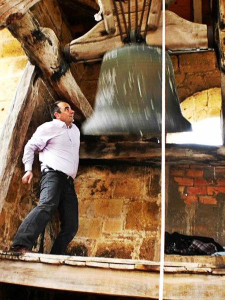 Antonino, con 75 años vividos, sigue teniendo la misma pasión por la campanas que sentía cuando, al salir de clase los sábados, corrían al campanario para tocar "a mañana fiesta". Siempre y cuando les dejaran los mayores. Hablamos con él a raíz del encuentro de campaneros que se celebró el pasado sábado en Puentedey, su pueblo. Nos contó el diferente número de clamores que se tocaban a muerto, según quien hubiera fallecido. Desde uno, si el protagonista era un forastero, a siete, si el muerto era el Papa. Se paró en los toques que marcaban el ritmo del día y aún recordaba la imagen de su abuelo, cuando a la hora del Ángelus, dejaba la labor, se quitaba la boina y se ponía de pie al oír las campanas. También habló de los toques civiles como el de la vereda... Escuchándole no pude evitar sentir cierto hermanamiento, ellos también trasmitían las noticias del pueblo. Lo contó todo con la emoción de quien ama lo que hace. También nos habló de su preocupación porque esa tradición se pierda. Para despedirse nos leyó un poema de Rosalía de Castro. En la imagen de Elena Alonso de Armiño se ve a Alberto, maestro de pequeños campaneros en Valdivielso.