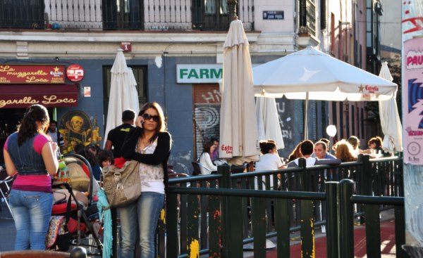 Otros Figaro y Susana tambien preparan la suya. Son de lejos. Han dejado el coche mal aparcado. Sorteando una valla de obra azul se han parado sobre una alfombra de asfalto caliente. Las arcadas de un depósito de agua y una rotunda señal de “dirección prohibida” sirven de marco al momento. La música… la ponen el ruido de coches. Resultado: una imagen de esto que llaman “aldea global”…